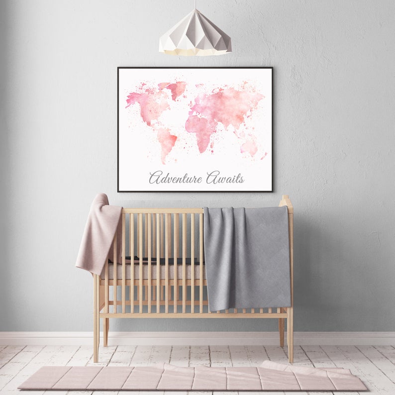 Adventure awaits, blush pink watercolor world map, Nursery baby